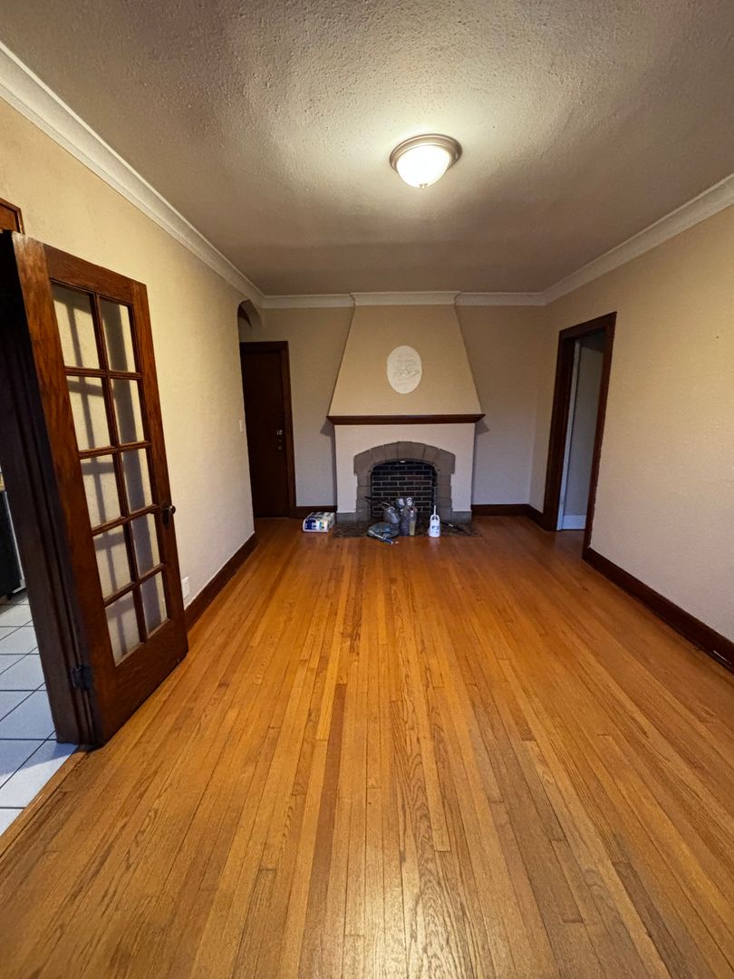 A standout feature of the living room is the original decorative fireplace, offering classic architectural detail and a cozy focal point. The updated kitchen includes refreshed cabinetry, a gas stove, refrigerator, and dishwasher for everyday convenience.